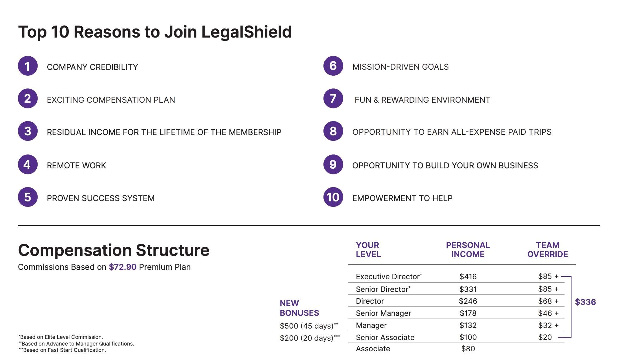 Our system provides the tools, training, and support needed to build a successful book of business from day one. Whether you are looking for a significant career change or a way to generate consistent additional income, you can leverage LegalShield's established billing and support network to scale your results. Review the revenue structure below to see how the compensation works.